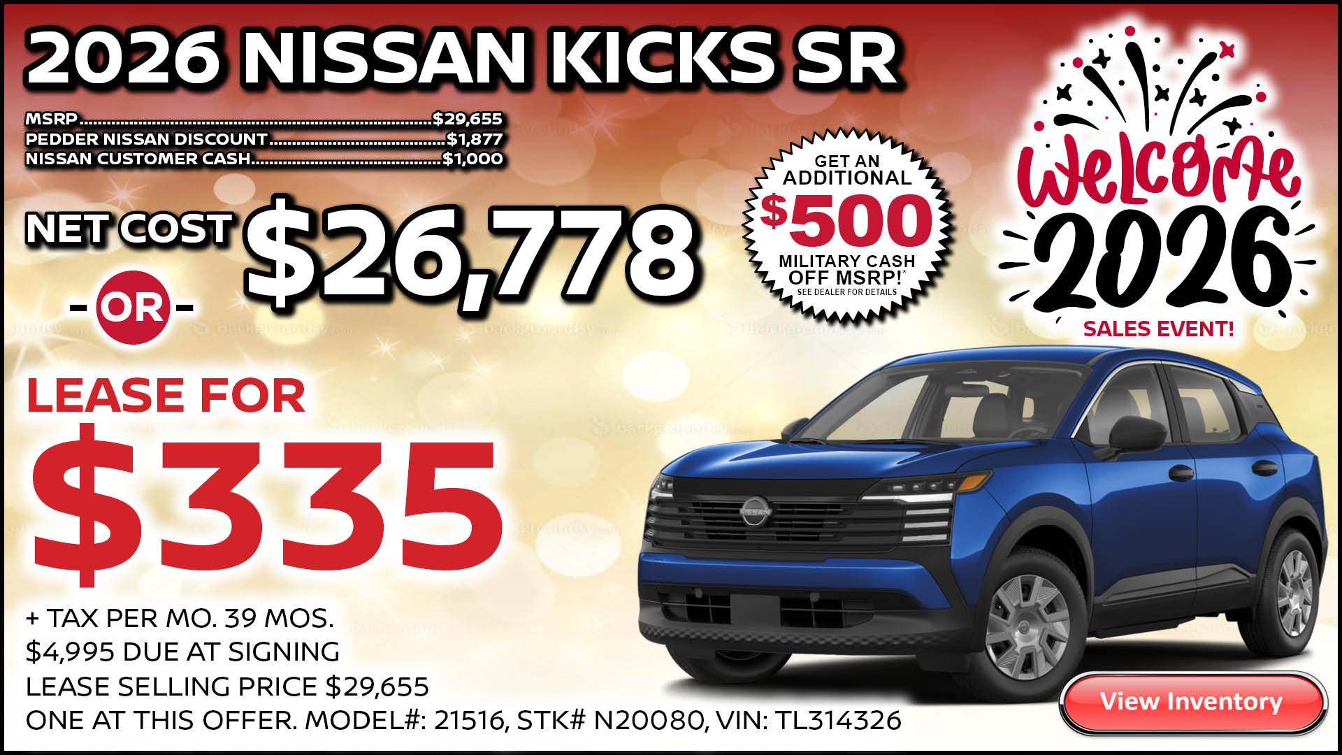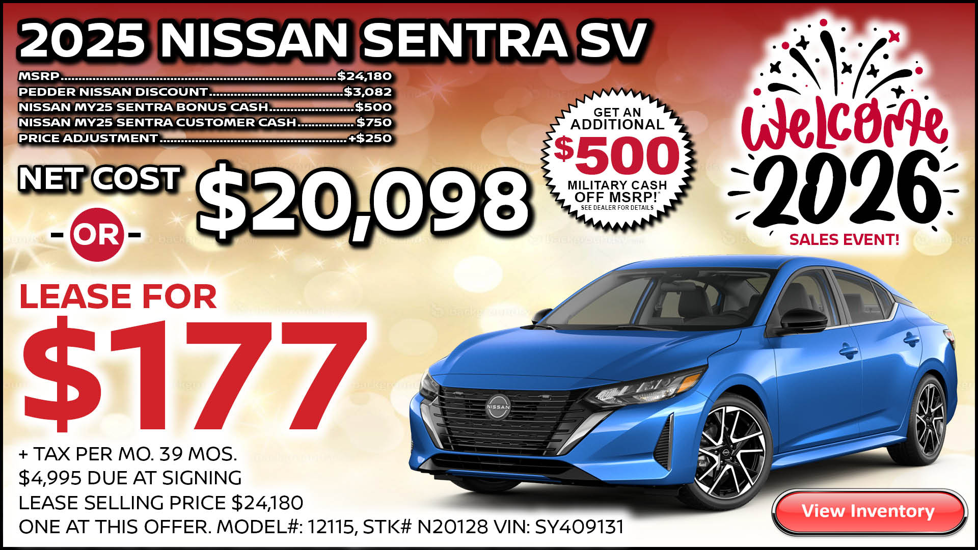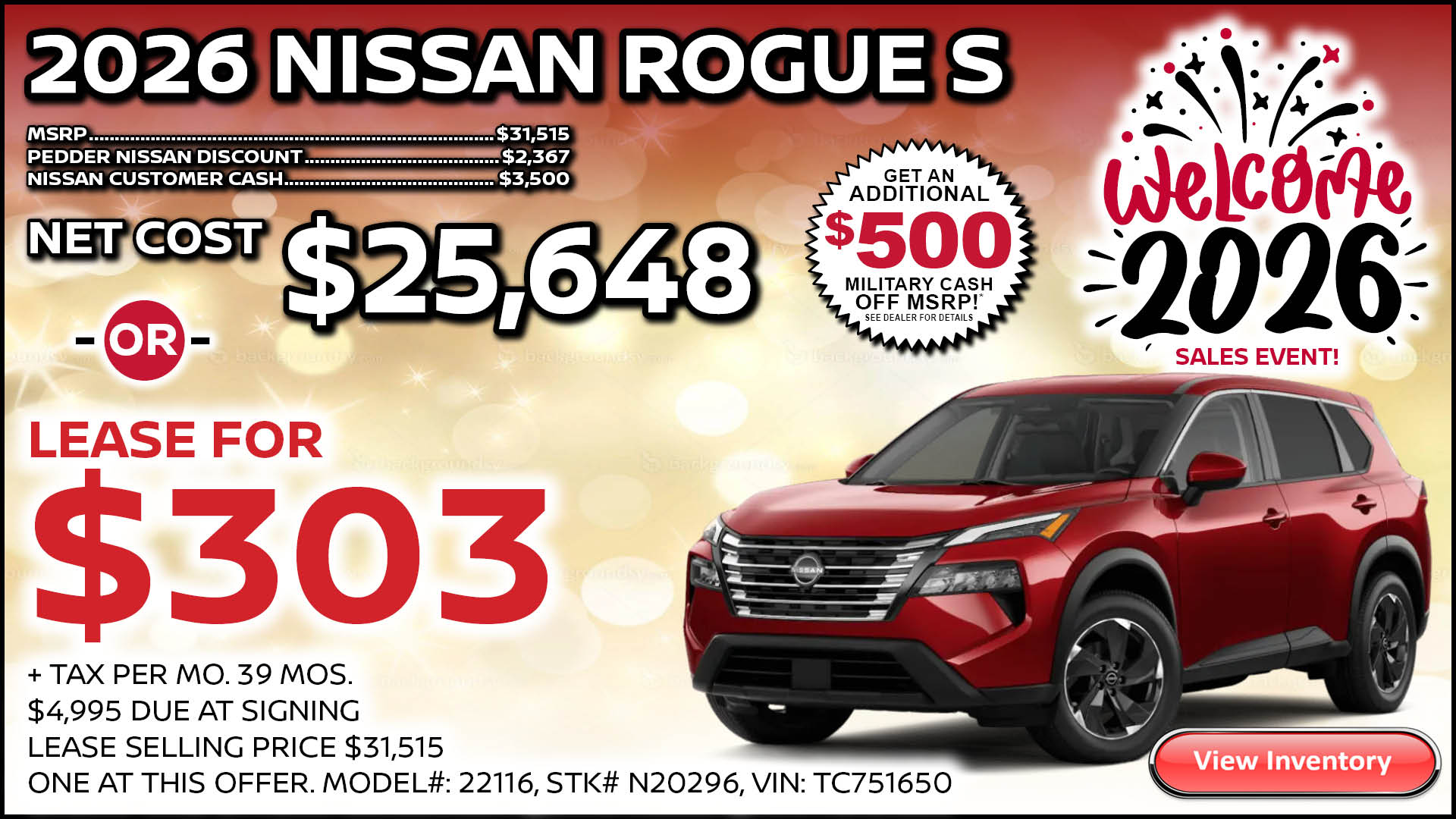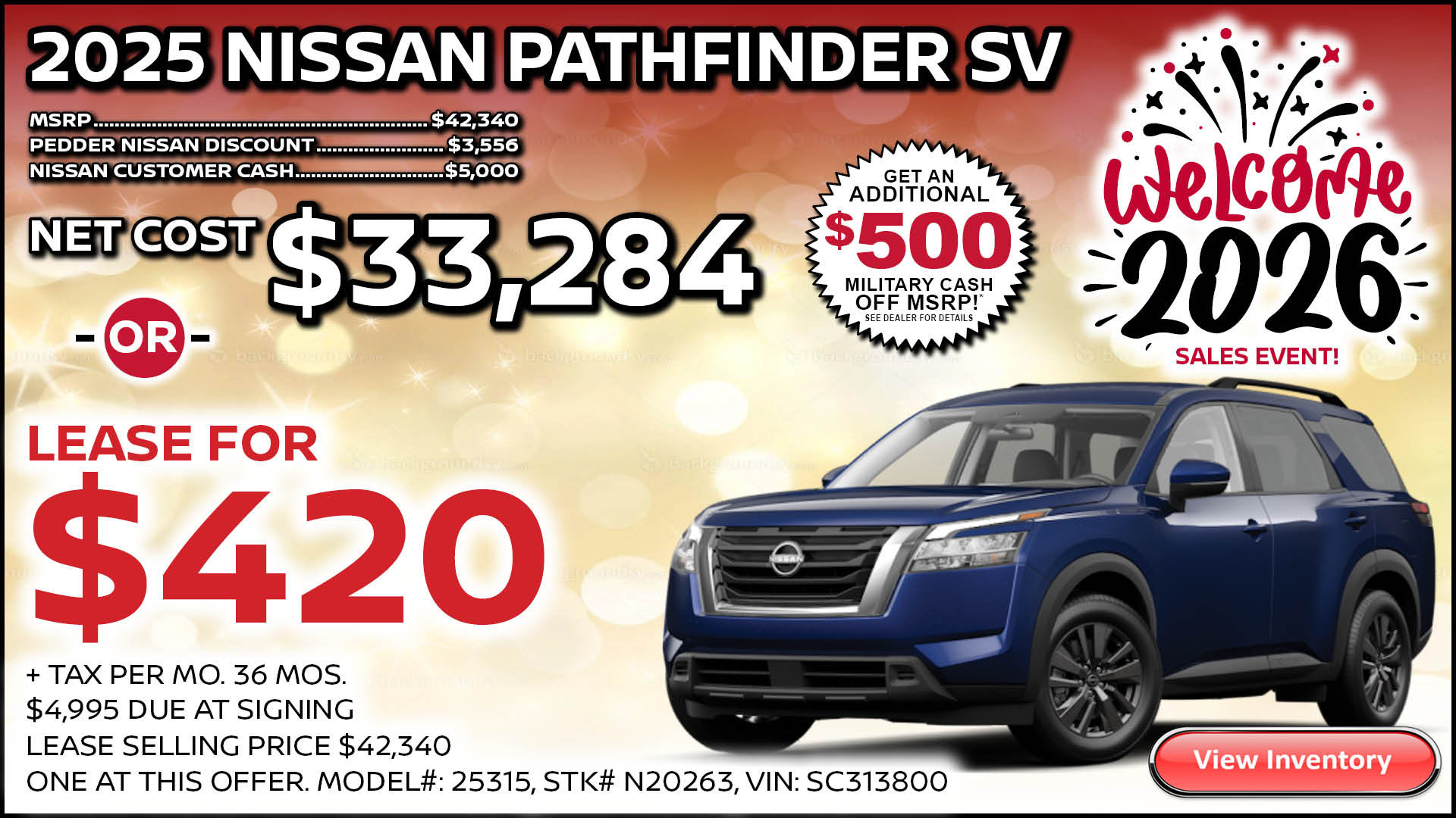Explore current new Nissan offers at Pedder Nissan in Hemet, CA. Our new-vehicle specials help you save on popular Nissan sedans, trucks, and SUVs, with limited-time incentives and exclusive dealership programs. Whether you’re shopping for a fuel-efficient sedan or a capable family SUV, our Hemet team is ready to help you find the right Nissan at a competitive price. Stop by Pedder Nissan to review available models, compare trims, and learn more about the incentives we can help you access.